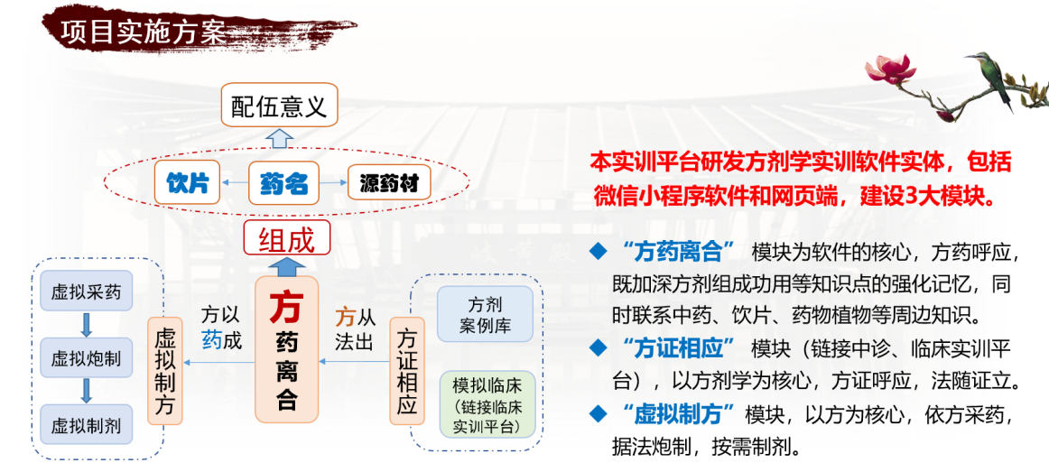 本实训平台研发的方剂学实训软件实体,包括手机APP移动端和PC端,建设3大模块:方药离合、虚拟制方(虚拟采药、虚拟炮制、虚拟制剂)和方证相应(链接中医经典诊疗平台)。