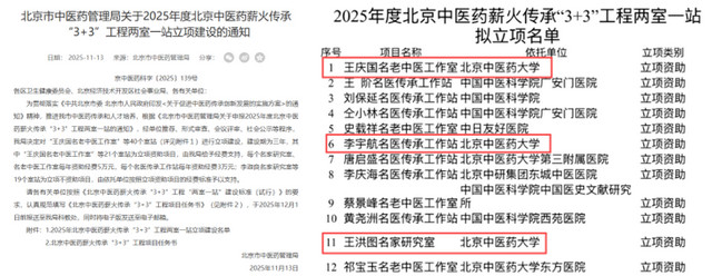 近日,北京市中医药管理局2025年度“3+3”工程室站立项名单正式发布。中医学院申报的3个室站成功获批,分别为王洪图名家研究室、王庆国名老中医工作室、李宇航名医传承工作站。此次获批彰显了我院在名医学术传承领域的深厚底蕴,也体现了学院在团队建设与人才培养方面的扎实成效。