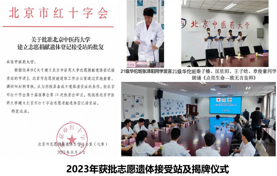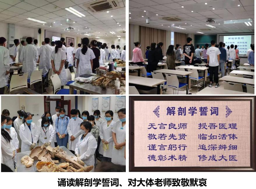 在学生进行第1次解剖标本实训观察前,组织学生参观解剖教研室的志愿捐献遗体接收站、人体标本展厅、向大体老师默哀、诵读解剖学誓词,组织医学生参加由北京市红十字会主办的 “生命追思”活动等解剖第一课教育,以大体老师的无私大爱的精神教育医学生热爱生命、敬畏生命、担起呵护生命的社会责任,树立正确的生命观,培养良好的医德医风,为人民健康服务,为中医药事业的发展、健康中国做贡献。
