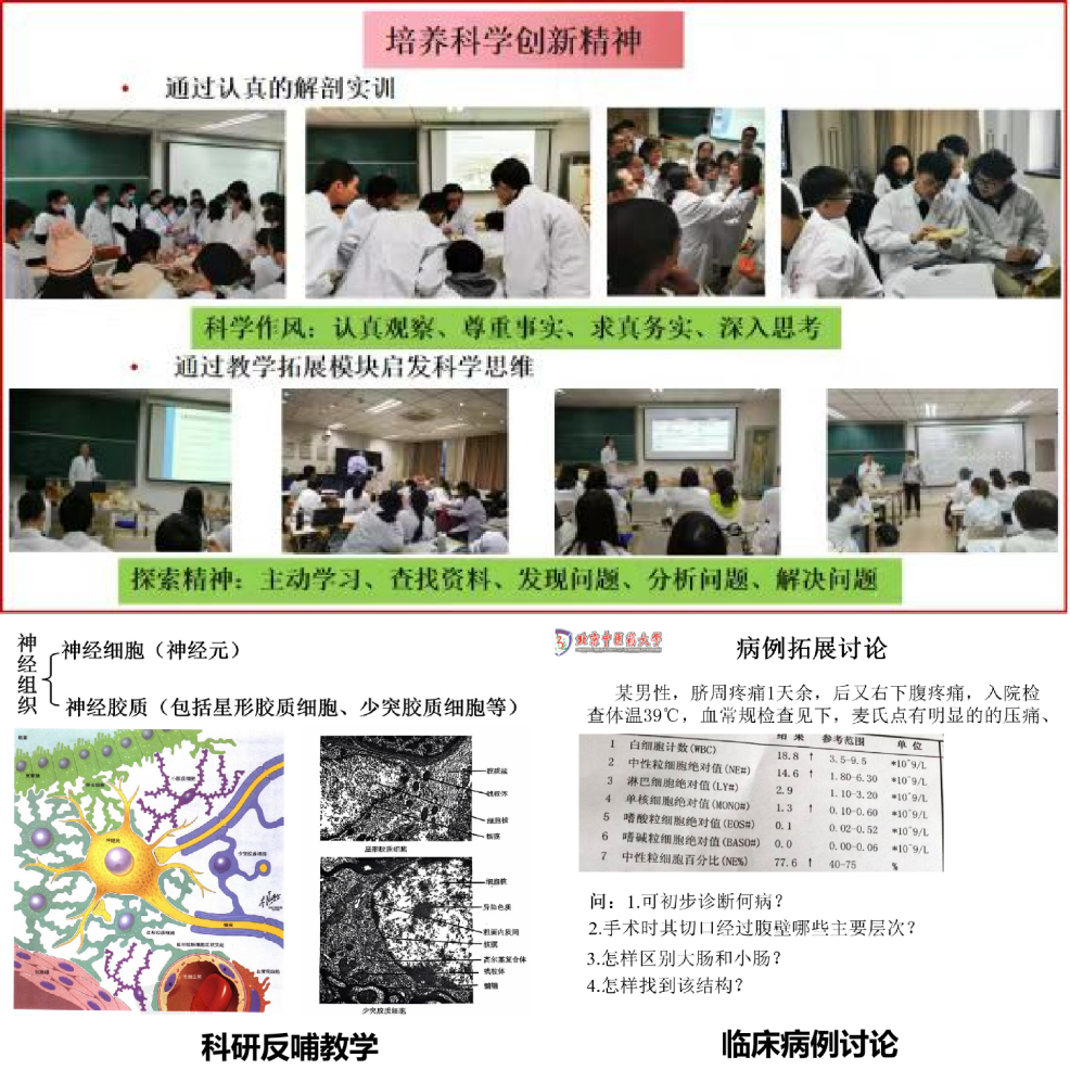 将临床案例、中医病案、针灸腧穴等内容引入到解剖教学中,增强了学生知识迁移的能力以及分析问题和解决问题的能力,增强了学生临床思维能力。在一线教育教学工作中践行科研反哺教学,能够引导学生进行研究性学习和创新性实践,在本科教学中也将团队科研的成果和相关的研究进展结合解剖学知识点引入课堂,开阔了学生的视野,启迪了学生的科研思维和好奇心,学生受益面广,充分发挥了课程对人才培养的主阵地、主渠道、主战场作用,充分体现了“双一流”A+专业学术型人才的培养目标。