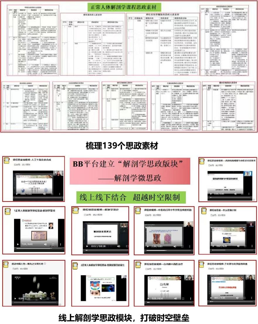 从爱心奉献、医德医风、敬畏责任、科学作风、中医自信、使命担当、家国情怀等多个方面深入挖掘解剖学科蕴含的思政元素,并将其凝炼打磨和升华,按系统章节密切结合解剖学知识点共梳理课程思政素材139个,有机融入解剖学课程教学的各个环节,包括进大纲、进教学设计、进课堂,实现价值引领与知识传授的有机统一,达到润物无声的育人效果。解剖学线上课程思政版块“解剖学的启迪与升华”及“解剖学微思政”,包含:“教师寄语”、“对无言良师的心里话”、“解剖学的过去、现在和将来”、“中医学中解剖学内容拾萃”、“学子笔下的解剖学”、“医学纪念日中的前世与今朝”、“解剖学思政元素微视频”等,深度挖掘解剖学课程中可以承载和实践的社会主义核心价值观的元素,全方位践行立德树人、教书育人的理念,取得了较显著的育人成效。