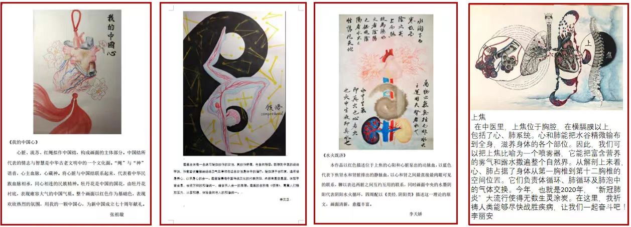 自2018年开始教研室每年都举办解剖学绘图大赛,并将优秀作品推送至全国解剖绘图大赛参赛。截止2024年,我校共取得全国医学生解剖绘图大赛一等奖5名、二等奖5名、三等奖2名的优异成绩。通过解剖学绘图大赛,进一步夯实了北中医学子的解剖学知识,激发了学生的艺术灵感,将解剖学知识和中医理论交相辉映、展现人文和科学精神、中医自信及抒发家国情怀,达到了以美化人、以美育人之效,既彰显了思政建设工作的高立意、实内容、巧方法,也体现了学生的知行合一。