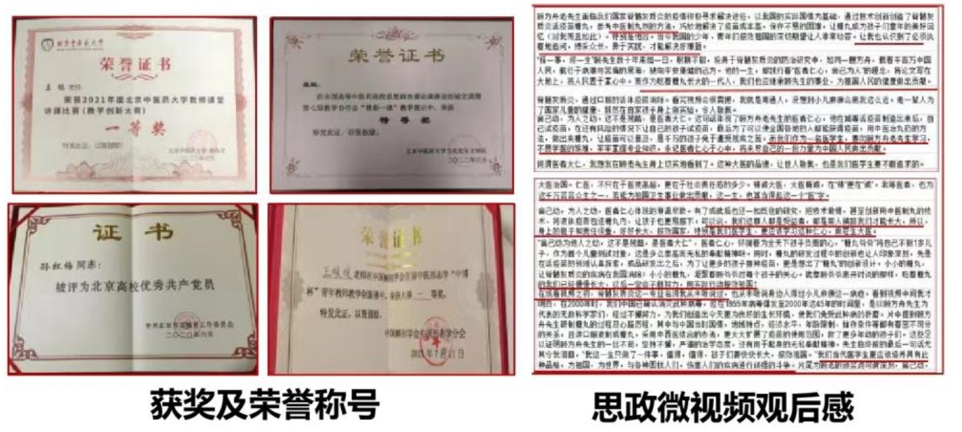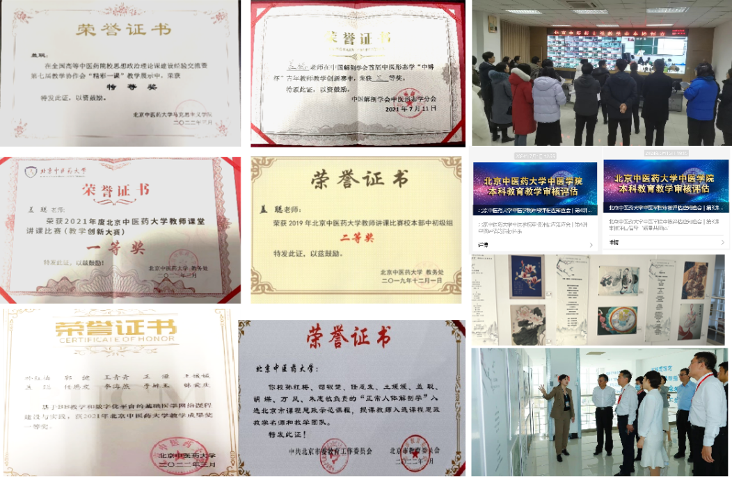 解剖教研室的课程思政建设经验,曾在兄弟院校(全国中医院校人体解剖学课程建设及思政教学改革研讨会,疫情期间线上进行)、我校第三附属医院、我校新教师的入学教育等会议做课程思政建设报告,受到了好评。很多同学通过微信、卡片等形式对教师表达:“跟老师学习不仅学到了解剖学知识,还学到的做人、做事的道理”,达到了较好的育人效果。2022年《正常人体解剖学》被评为北京市课程思政示范课程,人体解剖学育人团队于2022年获“北京市优秀本科育人团队”称号。
