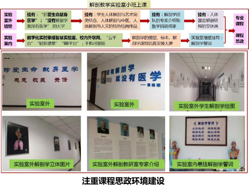 打造与课程思政相适宜的教学环境。在解剖教学实验室走廊和室内通过文字、图片、解剖绘画作品等进行课程思政相关的文化建设,以营造良好的育人氛围。解剖学教学采取小班授课形式,在实验室外走廊挂有“珍爱生命、献身医学”、“感恩、敬畏、责任”、“没有解剖学就没有医学”等字样;实验室外墙壁挂有学生解剖绘画作品,解剖绘画作品中充分展现了学生们的爱国热情和家国情怀、将知识性、创新性和艺术性完美结合,解剖学与中医药的完美融合也充分体现了中医药院校解剖学课程的特色;实验室内墙壁挂有解剖学誓词等课程思政环境建设内容。